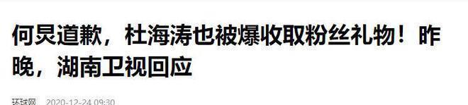 信息来源:百度百科——何炅 环球网——2020年12月24日——何炅道歉,杜海涛也被爆收取粉丝礼物!昨晚,湖南卫视回应 澎湃新闻——2015-05-26——“何炅吃空饷”爆料者遭威胁,党报:那些粉丝丧失三条底线